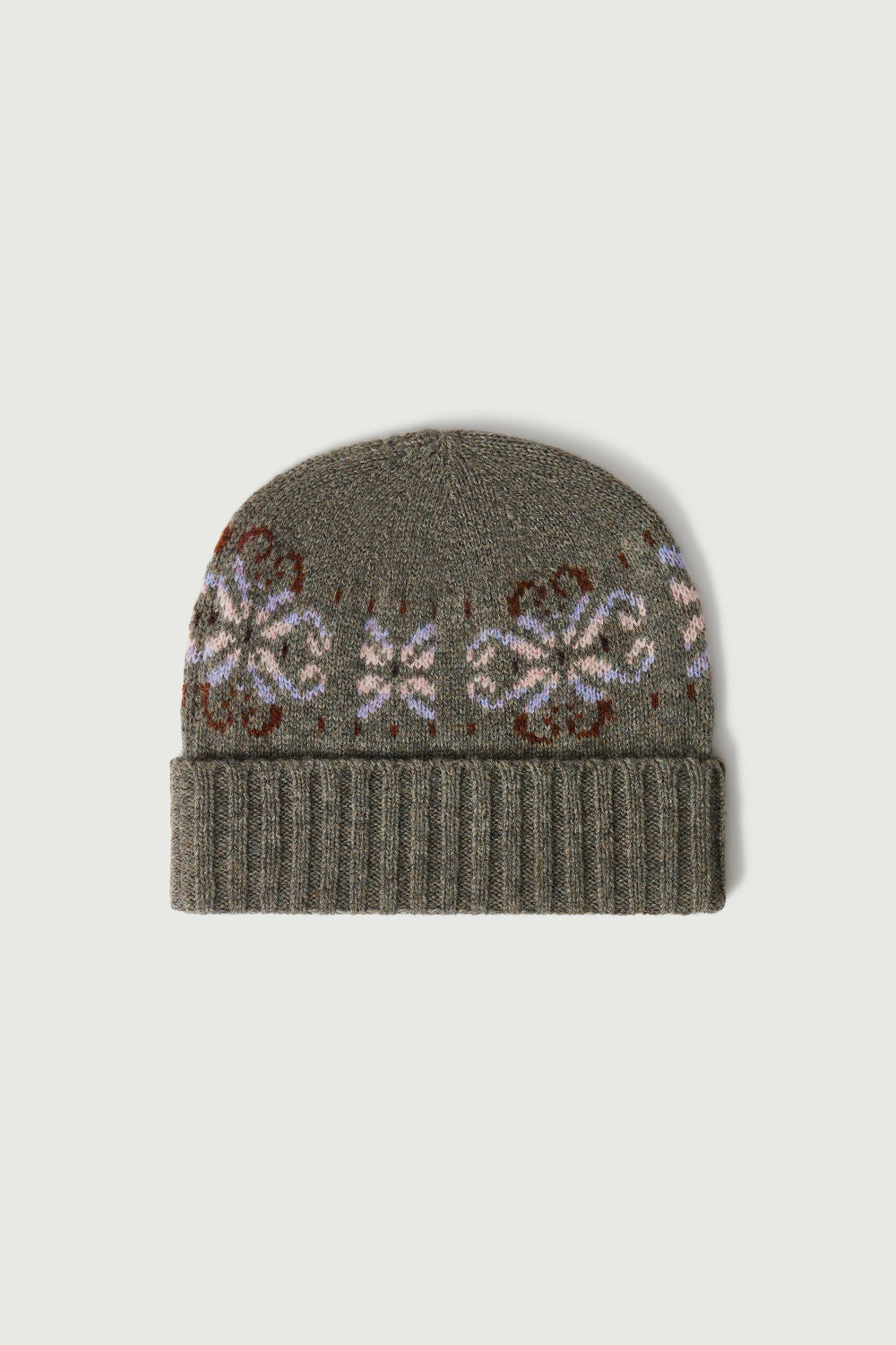 BERYL est un bonnet confectionné dans un motif jacquard d'inspiration anglaise, il se distingue par son design graphique élégant. Parfait pour affronter les journées fraîches avec une note de chic.