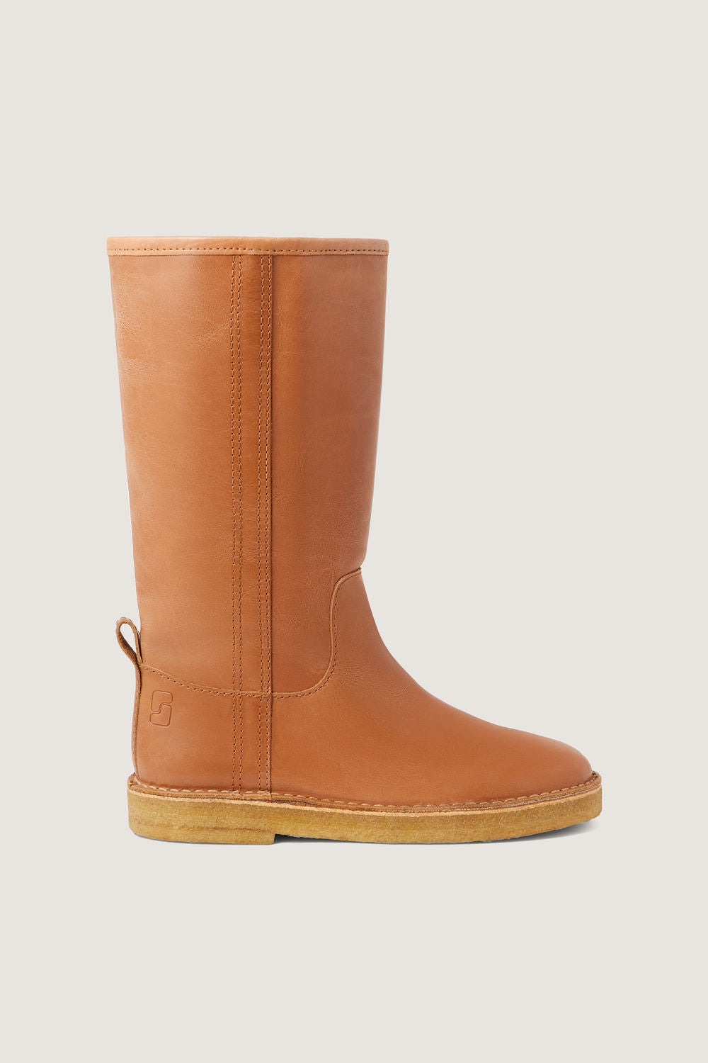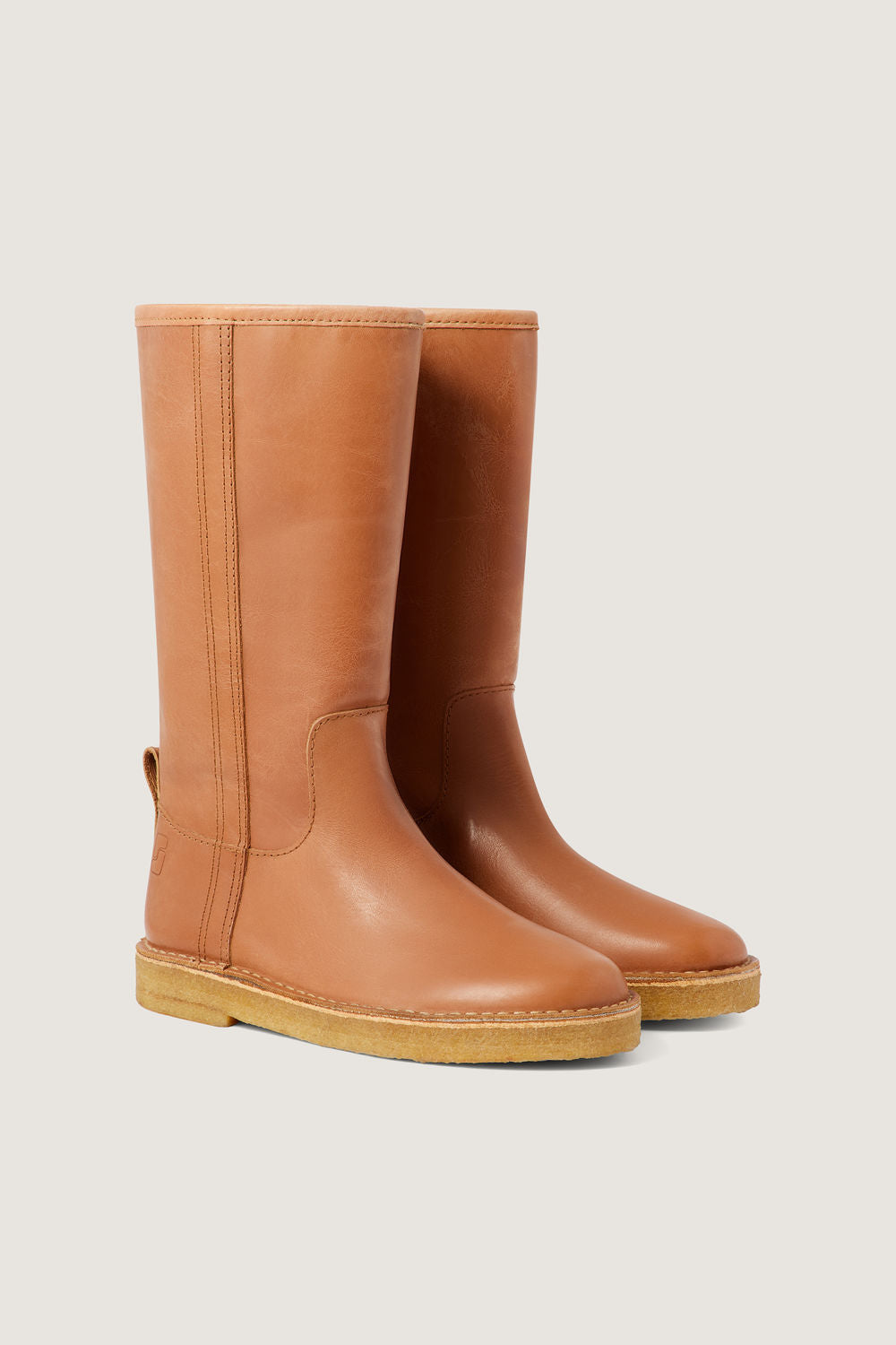 Bottes en cuir cognac - Bottes droites larges à enfiler- Semelle de crêpe épaisse- Hauteur de tige 30cm- Hauteur de talon 3cm- Cuir LWG