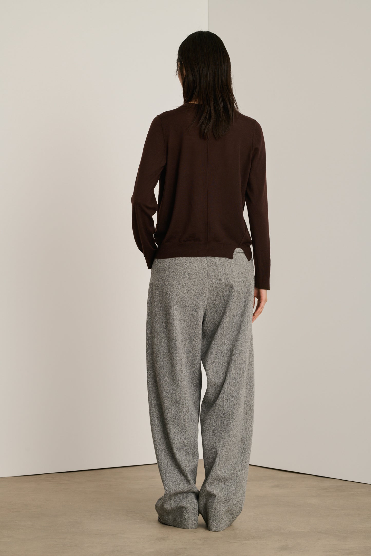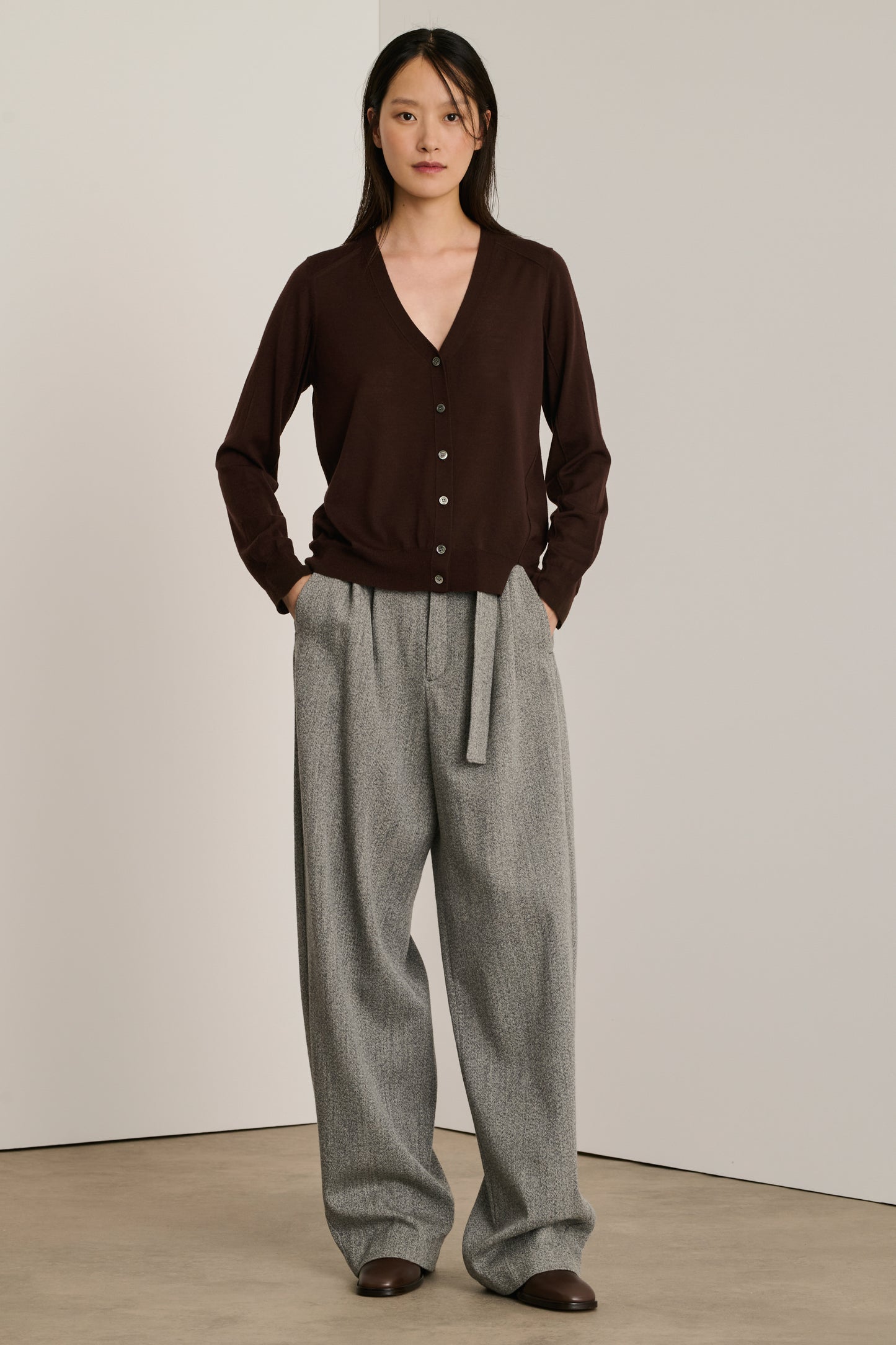 ALYSSA est un cardigan ample à large encolure en V. Il est tricoté dans une laine mérinos extra-fine à porter à même la peau. Asymétrie en bas de corps, diminutions, finitions bord-côtes et coutures retournées sont autant de détails qui agrémentent ce cardigan faussement classique.