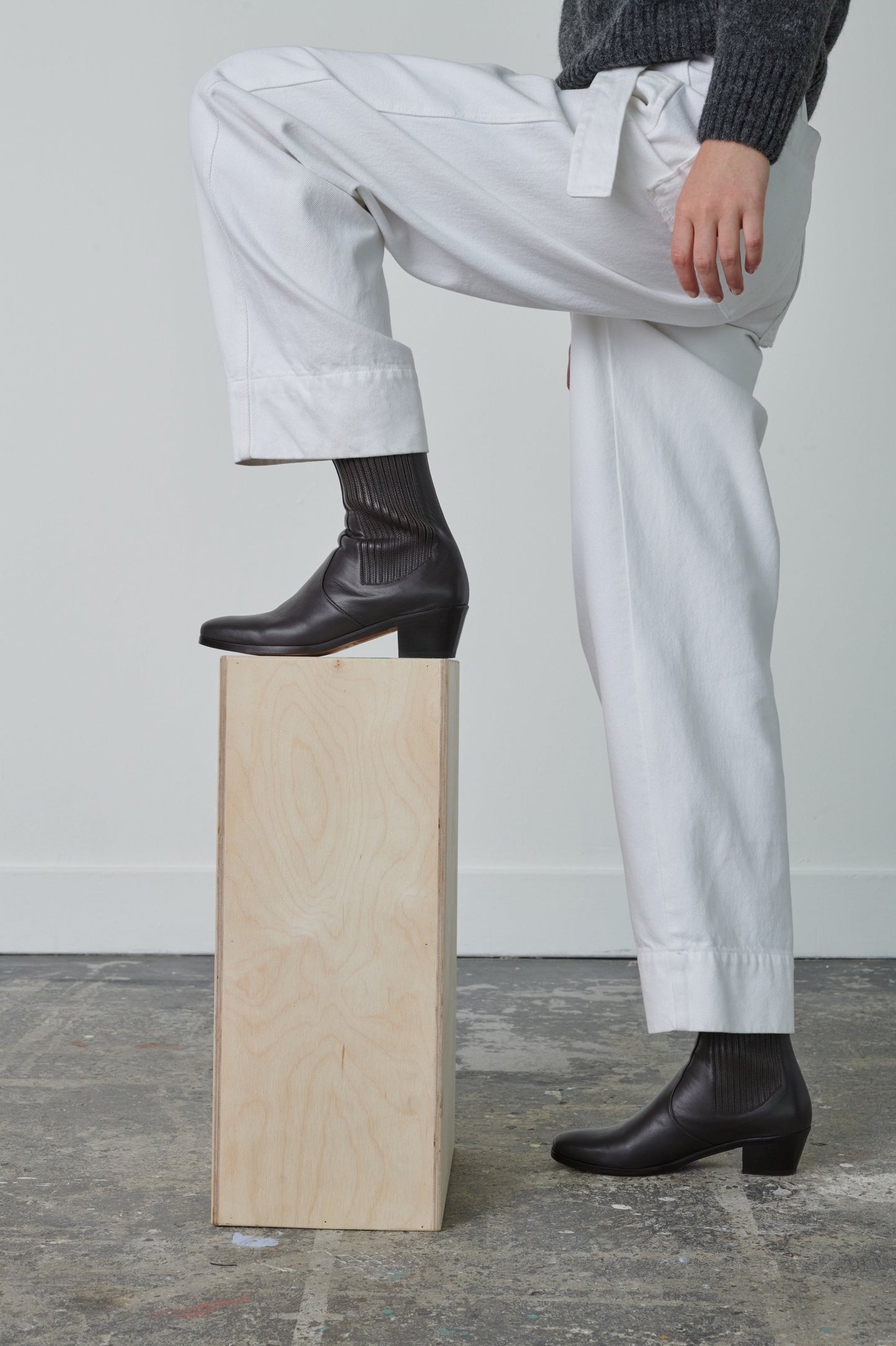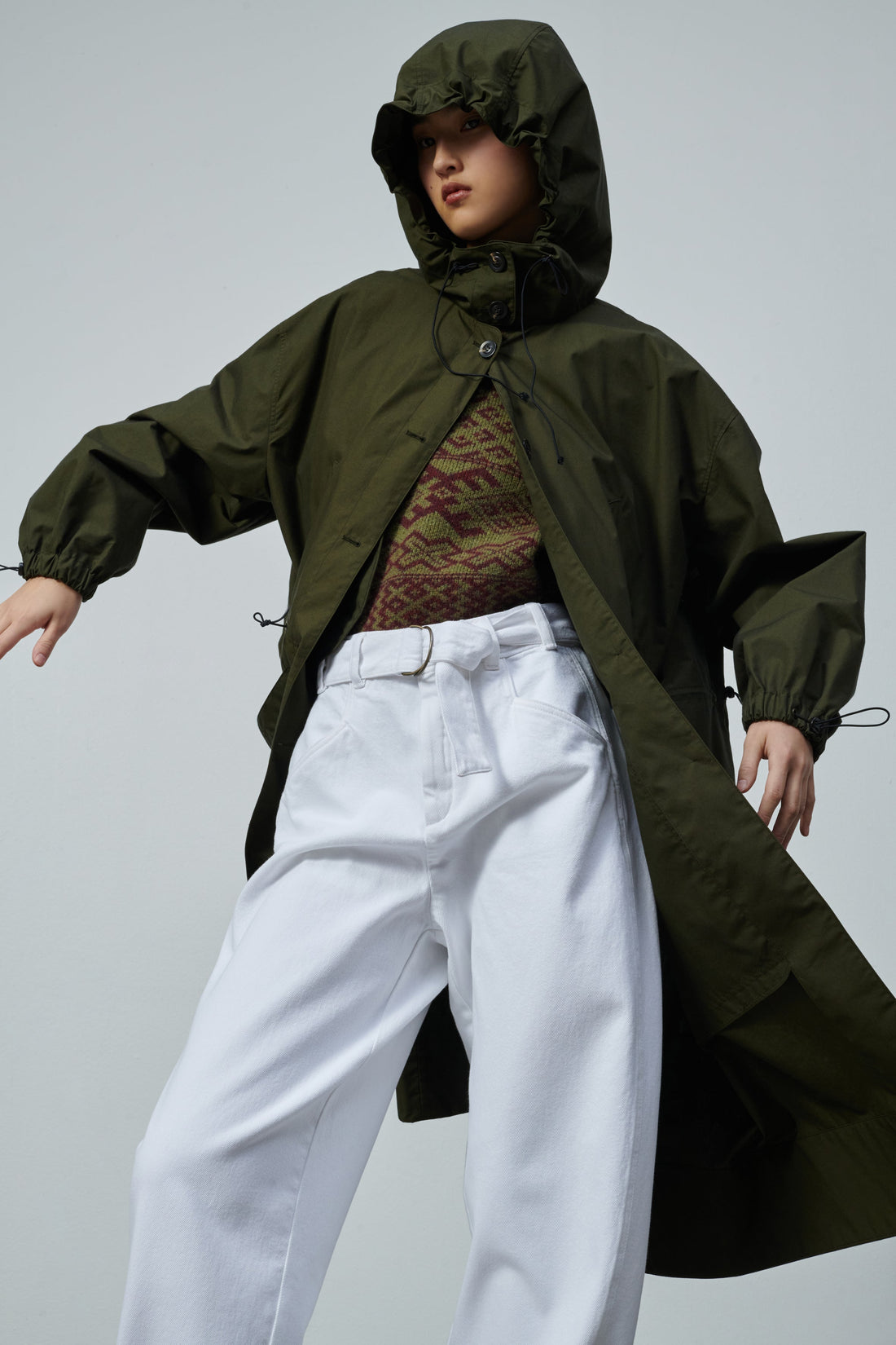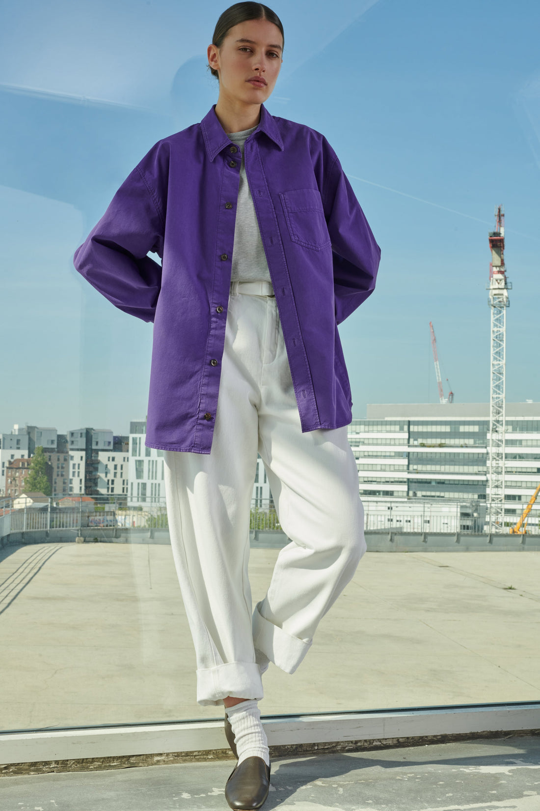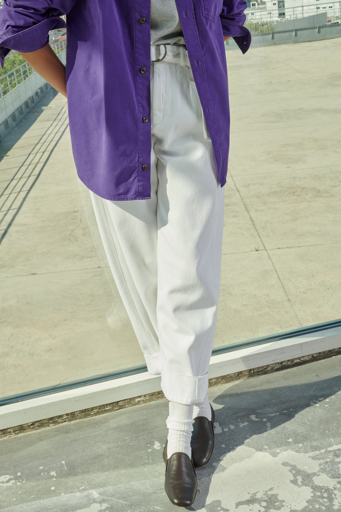 VOLAGE est un pantalon à la jambe ronde et large. Sa taille haute est à resserrer grâce à une ceinture large pour l'adapter à toutes les silhouettes. Il est reconnaissable par ses poches à la découpe en biais. La toile de denim est dense, ce qui apporte de la tenue.
