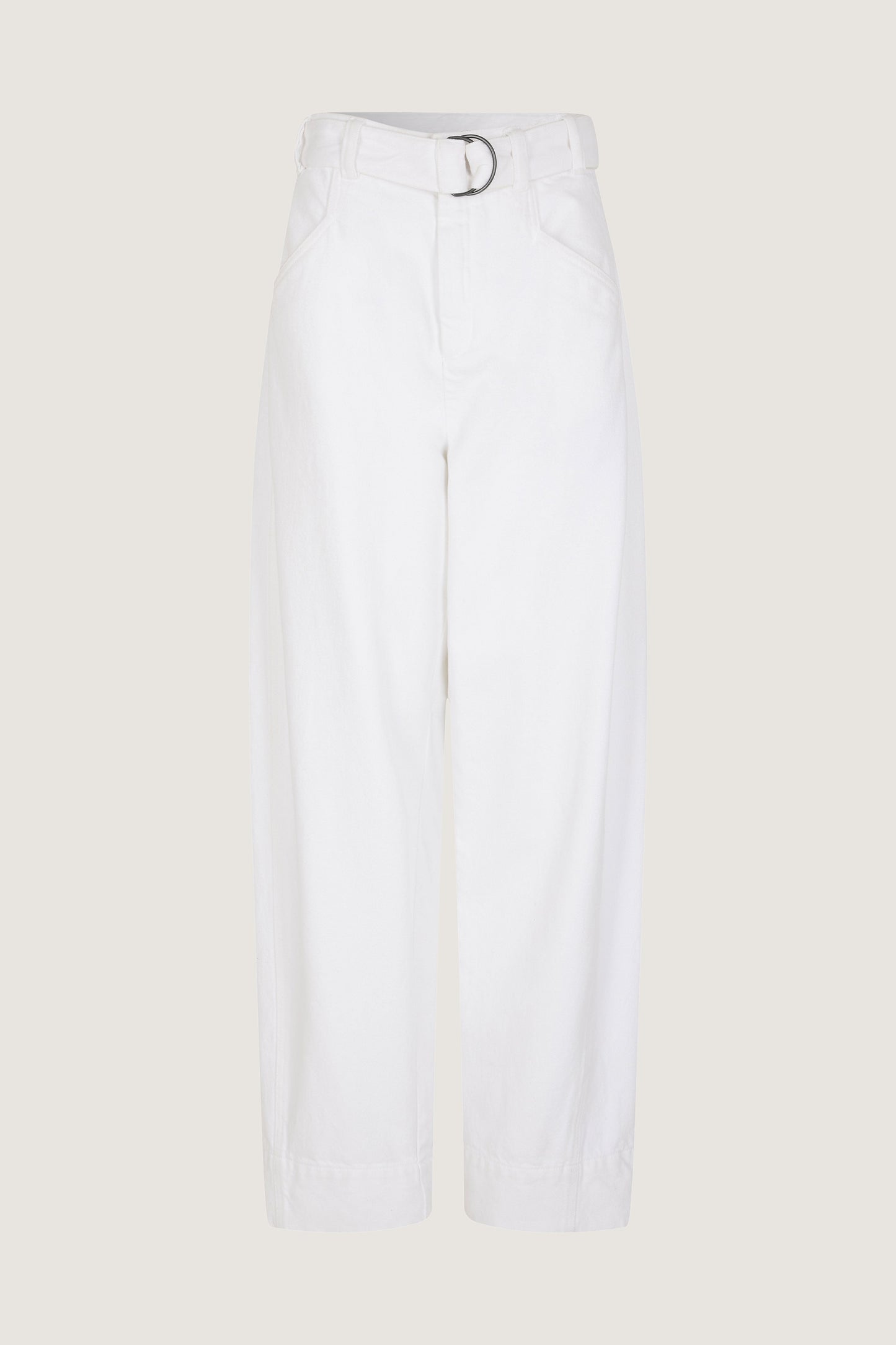 Pantalon ceinturé taille haute en denim blanc - Coupe légèrement arrondie- Ceinture à double boucle amovible- Deux poches plaquées au dos- Fermeture crochet à l’intérieur de la ceinture