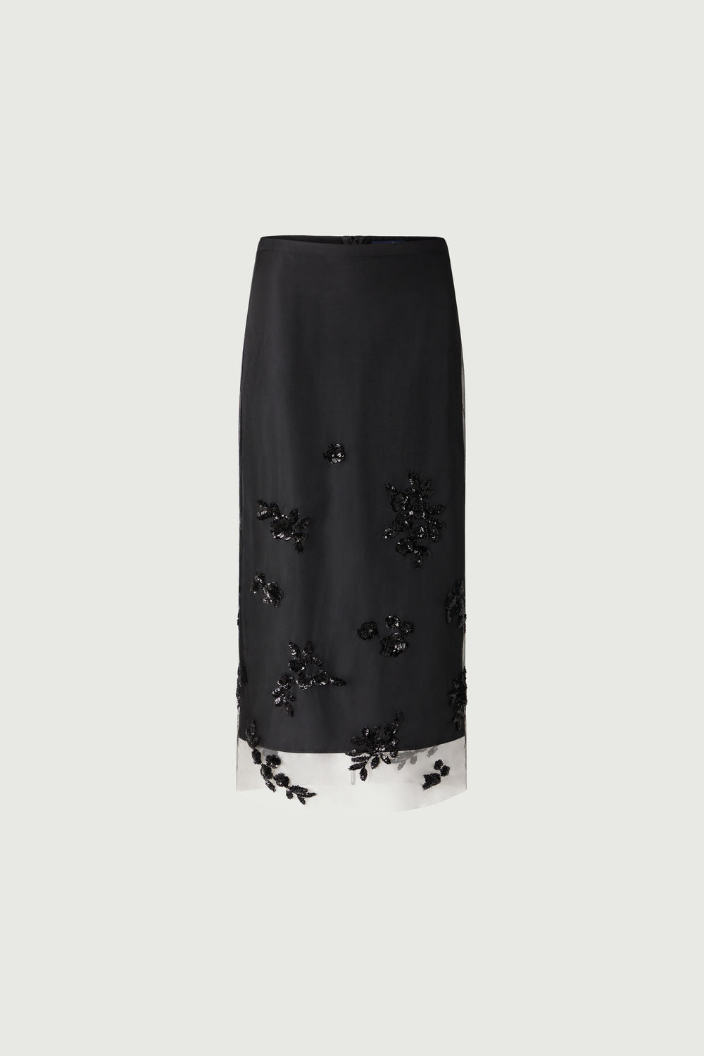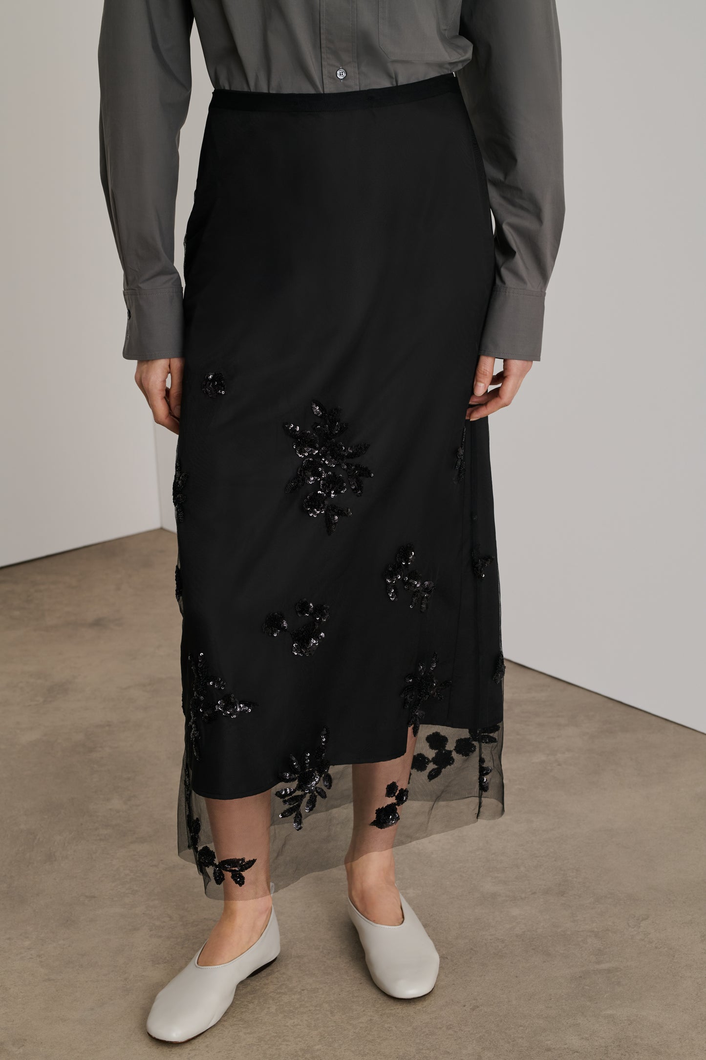 GRACE est une jupe longue élégante en tulle et applications de broderies. Faite de deux parties : un jupon doublure pour freiner la transparence, et par-dessus une jupe en tulle noire sur-brodées d'éléments floraux en sequins noirs du bas vers le haut. Elle se ferme par deux zips invisibles. Versatile cette jupe peut se porter avec ou sans son jupon selon l'audace.