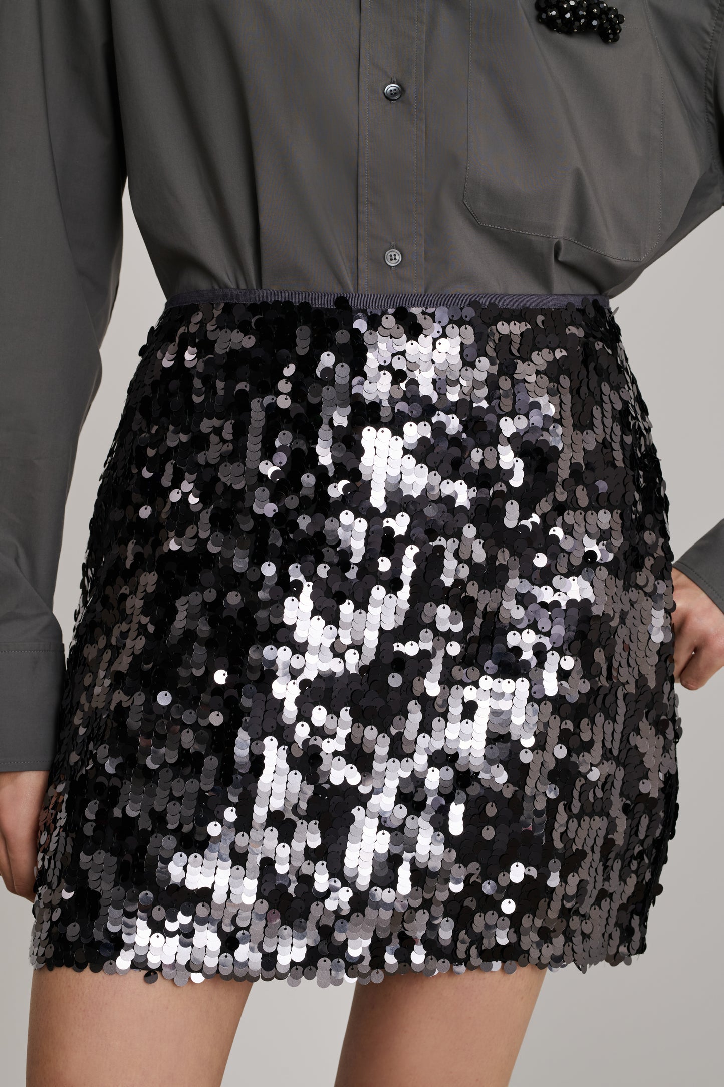 ROBBIE est une jupe courte réalisée dans un tissu à sequins. Nuances de bleu et de gris anthracite se confondent pour créer une teinte unique qui sublimera vos tenues de soirée. Entièrement doublée, elle se porte posée sur les hanches. Sa coupe est courte et droite.
