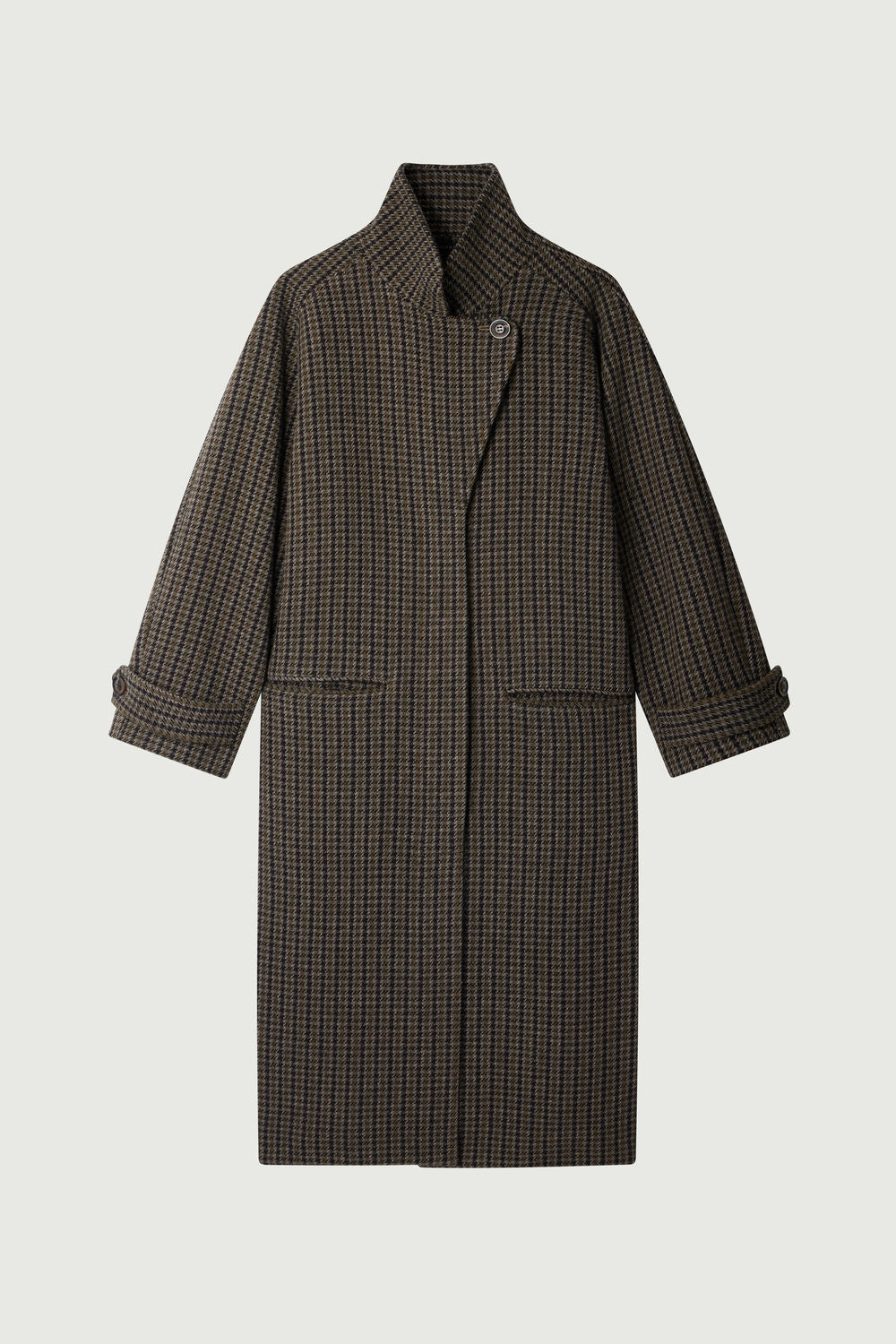 OSCAR est un manteau long en tweed de laine à carreaux. Il dispose de manches raglan pour un confort optimal et d'un col polyvalent qui peut se porter ouvert ou fermé. L'ouverture avec patte de boutonnage cachée assure une finition élégante, tandis que les deux poches passepoilées à l'avant ajoutent une touche pratique et sophistiquée.
